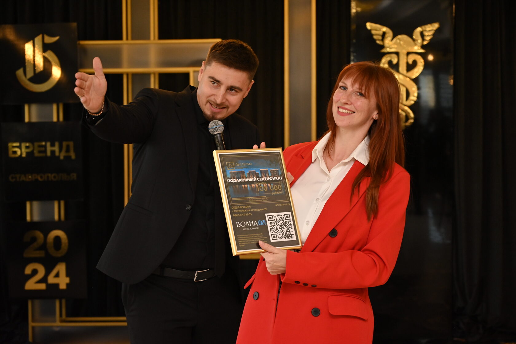 На премии «Бренд Ставрополья 2024» мы не только отметили свои достижения, но и порадовали гостей приятным сюрпризом — розыгрышем сертификата на сумму 100 000 рублей! Поздравляем владелицу сертификата, его можно использовать для покупки квартиры в жилом комплексе "Волна".